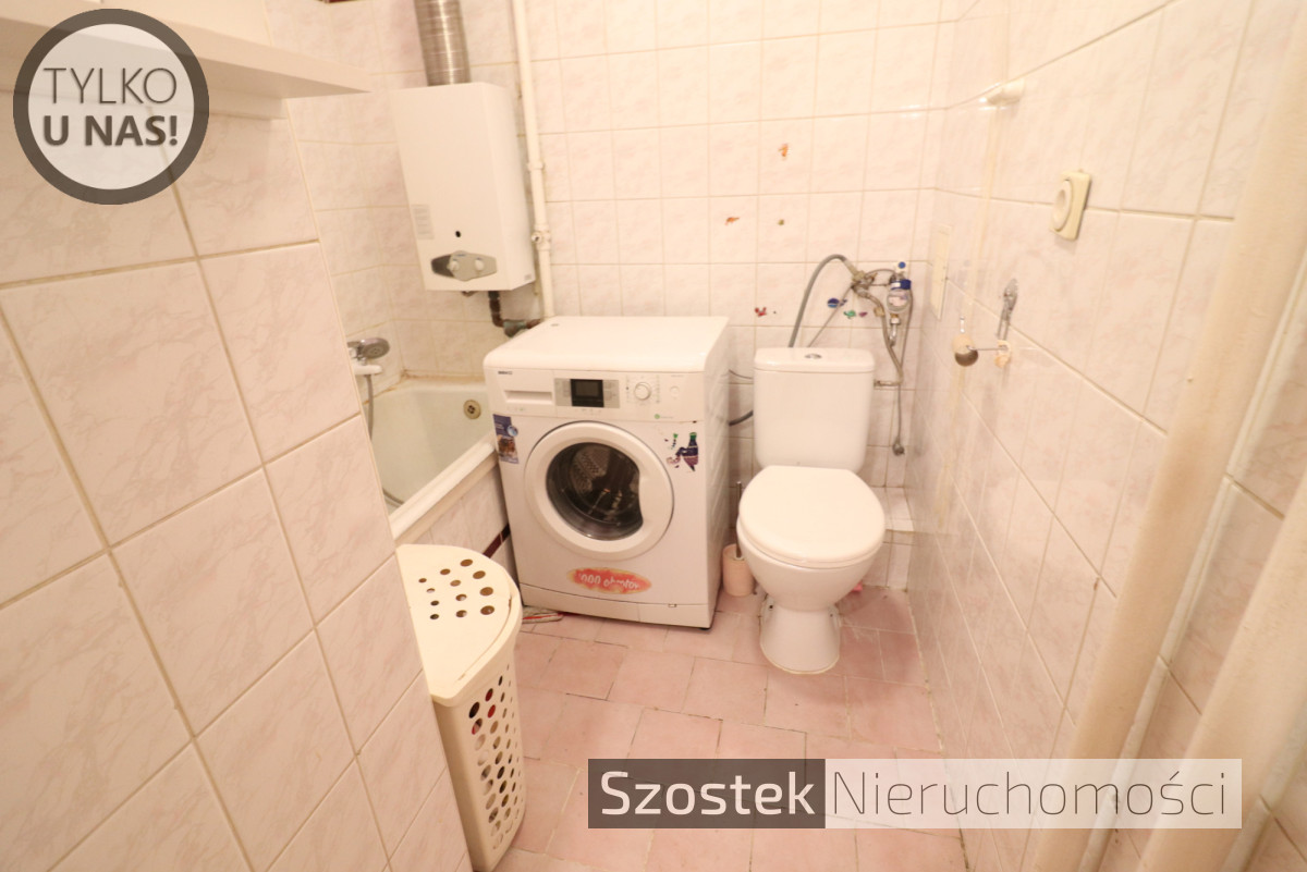 W łazience: stała zabudowa oraz pralka. Kuchnia wyposażona w kuchenkę gazową z piekarnikiem elektrycznym oraz zlew.