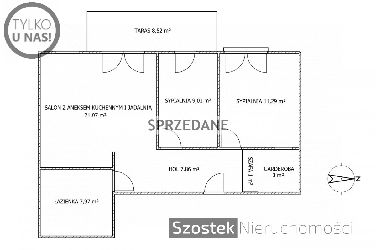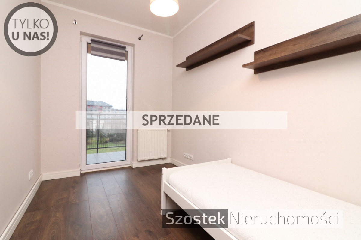 Mieszkanie 3 pokojowe o powierzchni 61,2 m², zlokalizowane na 3 piętrze, nowoczesnego 4 piętrowego budynku z windą z 2012 roku. Układ pomieszczeń obejmuje salon z dużym i wygodnym aneksem kuchennym, dwie sypialnie, dużą i wygodną łazienkę oraz hol. Ekspozycja okien na zachód. Do mieszkania przynależy taras 8,52 m² i komórka lokatorska 3,7 m².